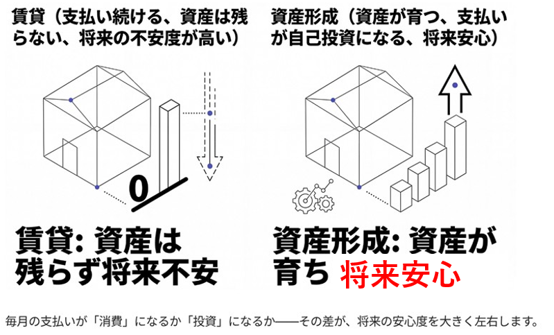 「賃貸に住み続ける」ことと「資産形成しながら暮らす」ことは、同じ月々の支払いでも、10年後の財産が大きく変わります。